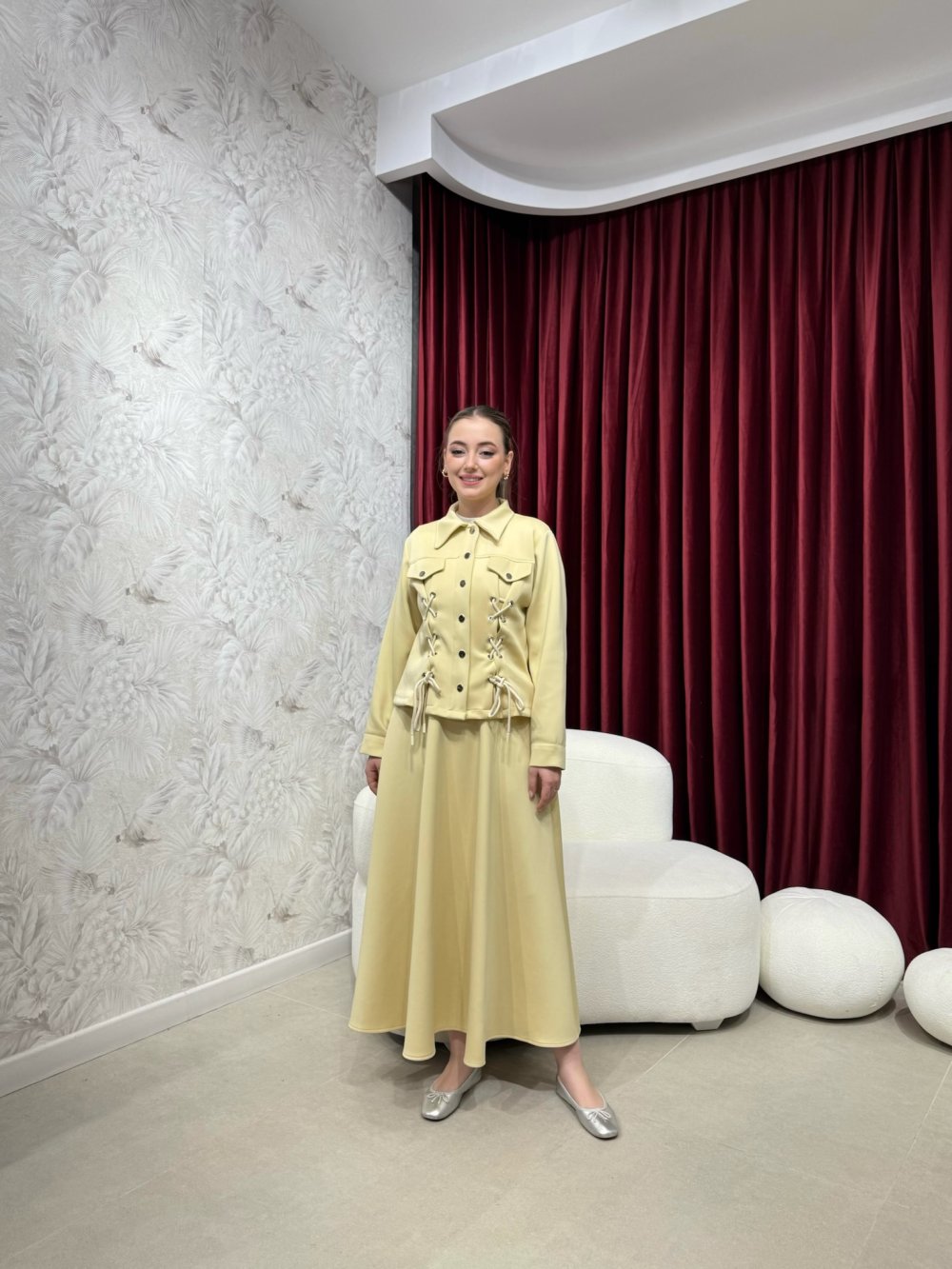 Ceket klasik yaka, boydan çıtçıtlı, kollar manşetli, aksesuar cep kapaklı ve bağcık detayıdır.