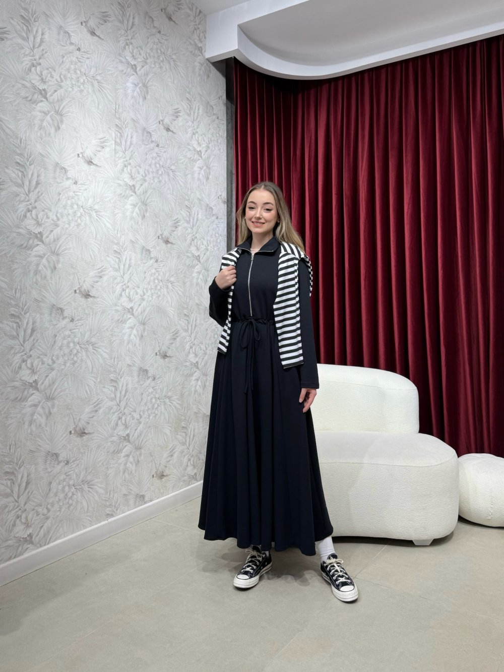 Ürünümüz pamuk kumaştan üretilmiştir. Klasik yaka, önden fermuarlı, belden ayarlanabilir tünel ipli olup kloş kesime sahiptir. Astarsızdır.