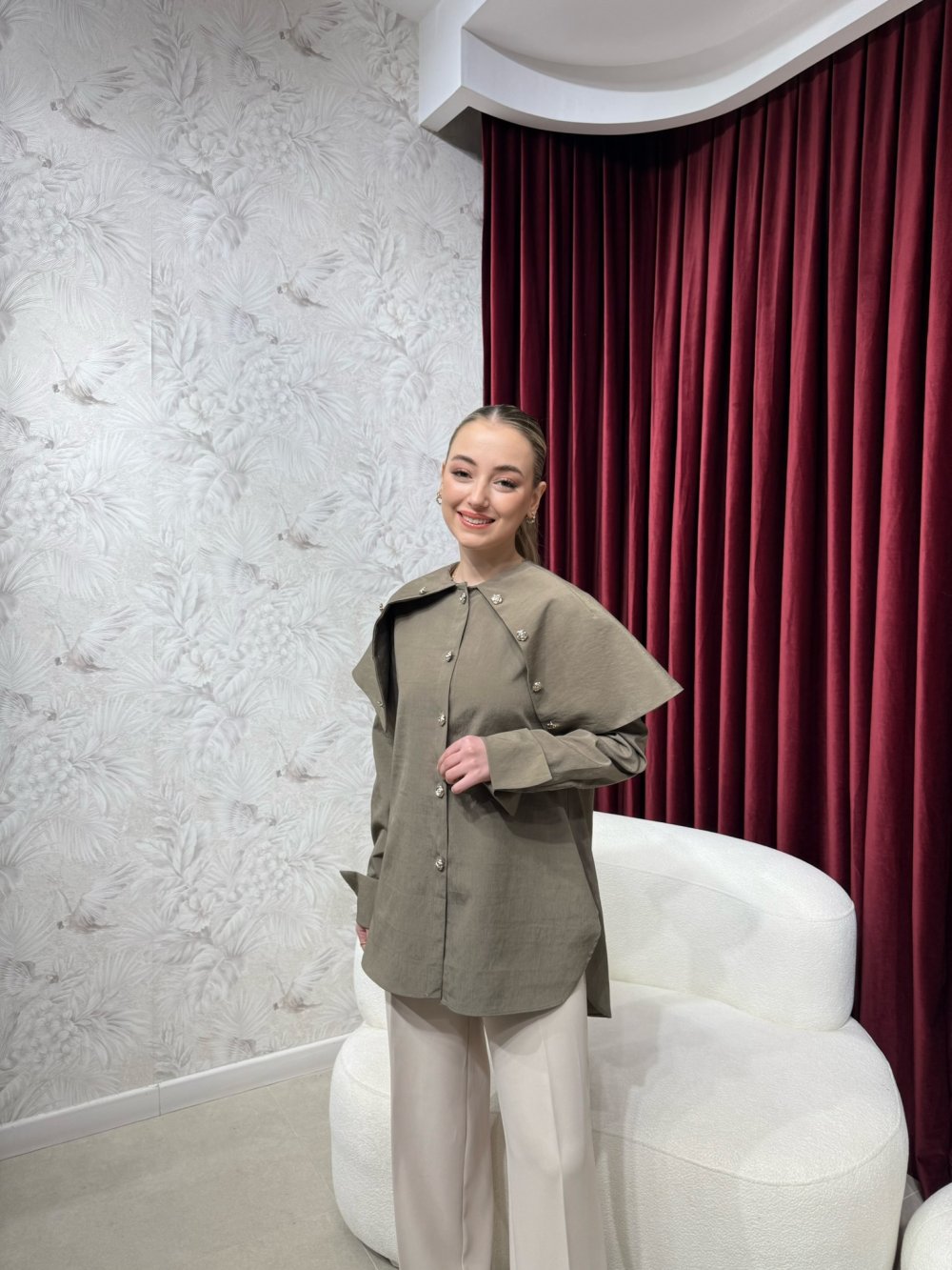 Ürünümüz mango kumaştan üretilmiştir. Aksesuar düğme detaylı büyük yaka, boydan düğmeli, yanlardan yırtmaçlı, kollar katlama detaylı olup manşetlidir.