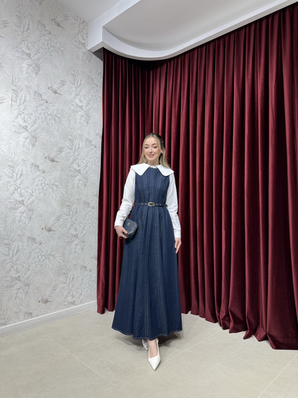 Ürünümüz denim kumaştan üretilmiştir. Bisiklet yaka, arkadan fermuarlı, belden oturmalı etek kısmı kloş kesime sahiptir. Seyyar kemer ile birlikte gönderilmektedir.