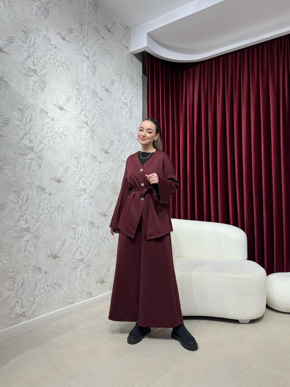 Ceket V yaka aksesuar gold düğmeli, düşük omuzlu olup seyyar kuşak ile birlikte gönderilmektedir.