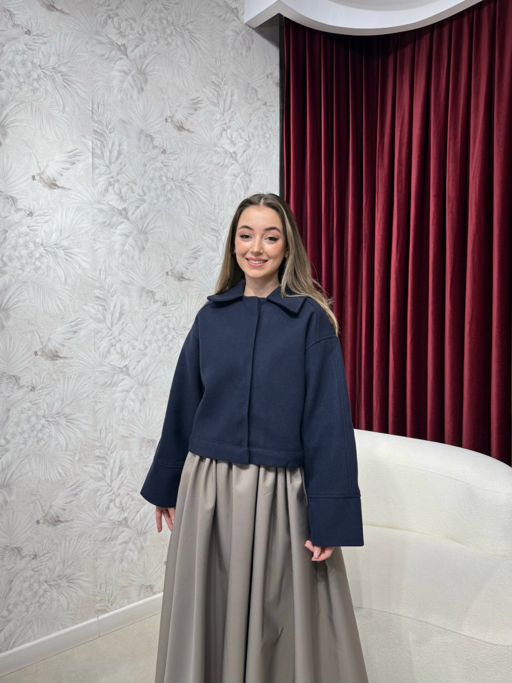 Klasik yaka, boydan gizli düğmeli olup düşük omuzludur. Tamamı astarlıdır.