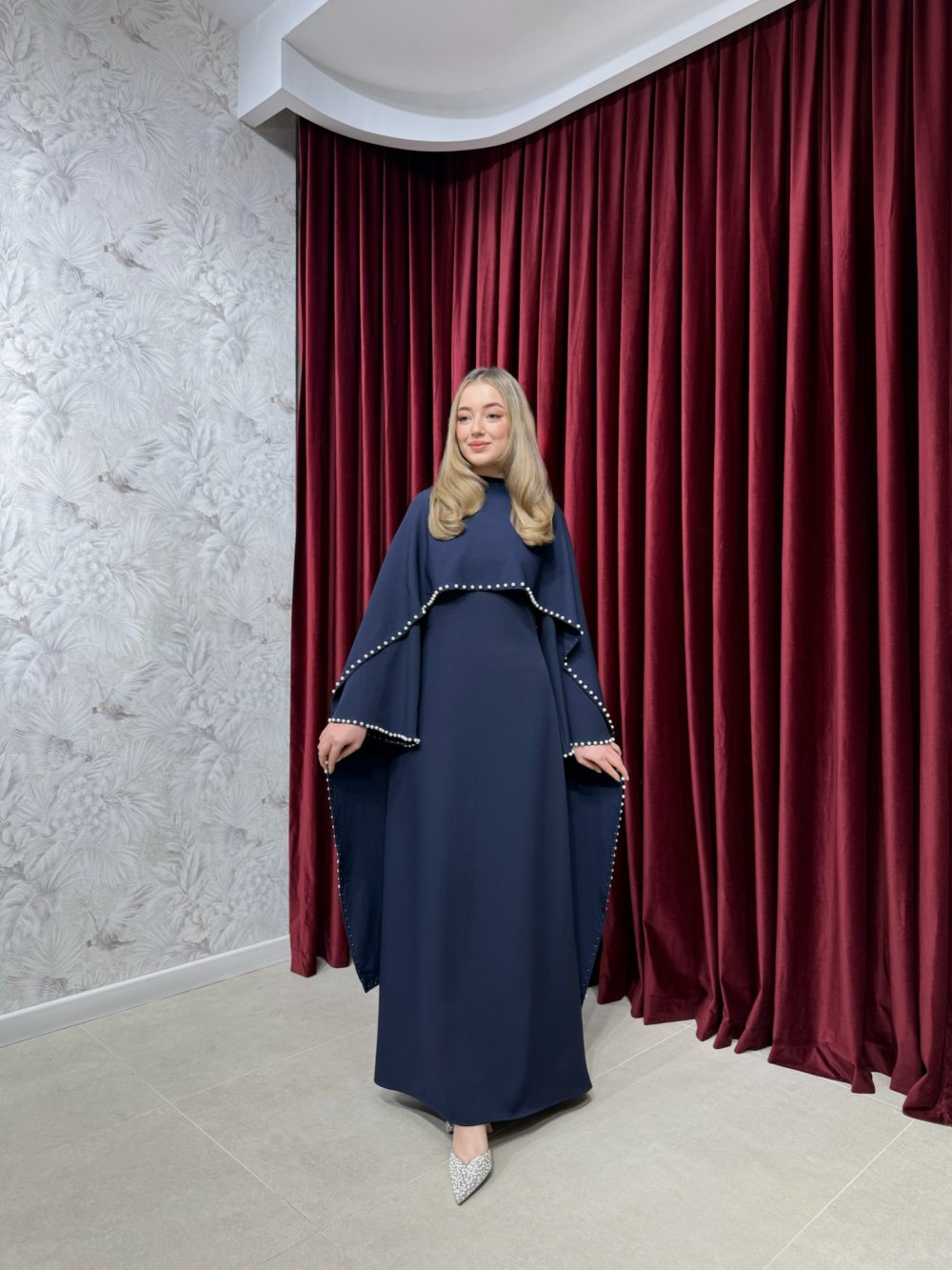 Yuvarlak yaka, arkadan fermuarlı ve ayarlanabilir bağcık iplidir. Belden oturtmalı olup kolları inci işlemelidir.