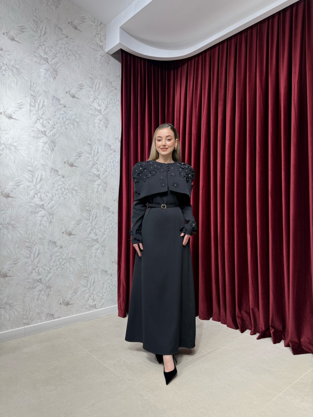 Ürünümüz krep kumaştan üretilmiştir. Bisiklet yaka, arkadan fermuarlı, kollar taşlı çiçek motif işlemeli olup düz kesime sahiptir. Taşlı çiçek motif işlemeli, önden düğmeli seyyar pelerini mevcuttur. Astarsızdır.