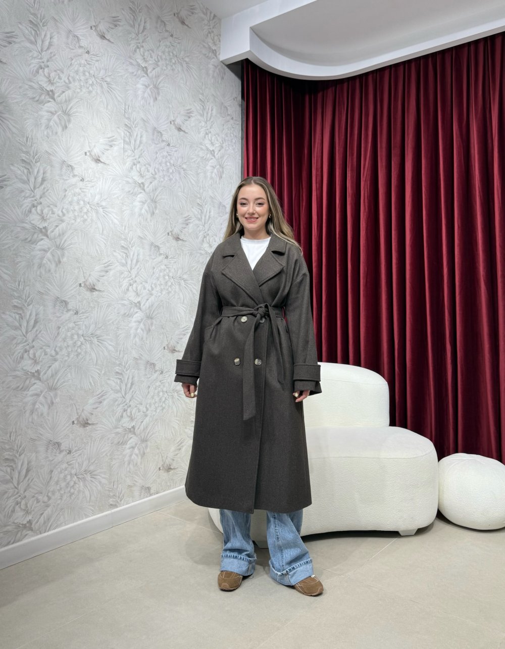 Ürünümüz premium kaşe kumaştan üretilmiştir. Kruvaze yaka, önden düğmeli, oversize kesim, arkadan yırtmaçlı, tamamı astarlı olup seyyar kuşak ile birlikte gönderilmektedir.