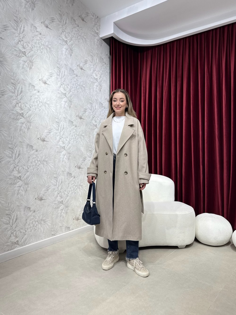 Ürünümüz premium kaşe kumaştan üretilmiştir. Kruvaze yaka, önden düğmeli, oversize kesim, arkadan yırtmaçlı, tamamı astarlı olup  seyyar kuşak ile birlikte gönderilmektedir.