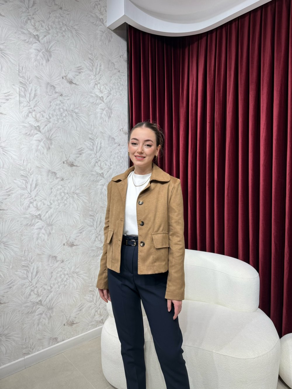Klasik yaka, önden düğmeli, aktif iki cepli olup tamamı astarlıdır.