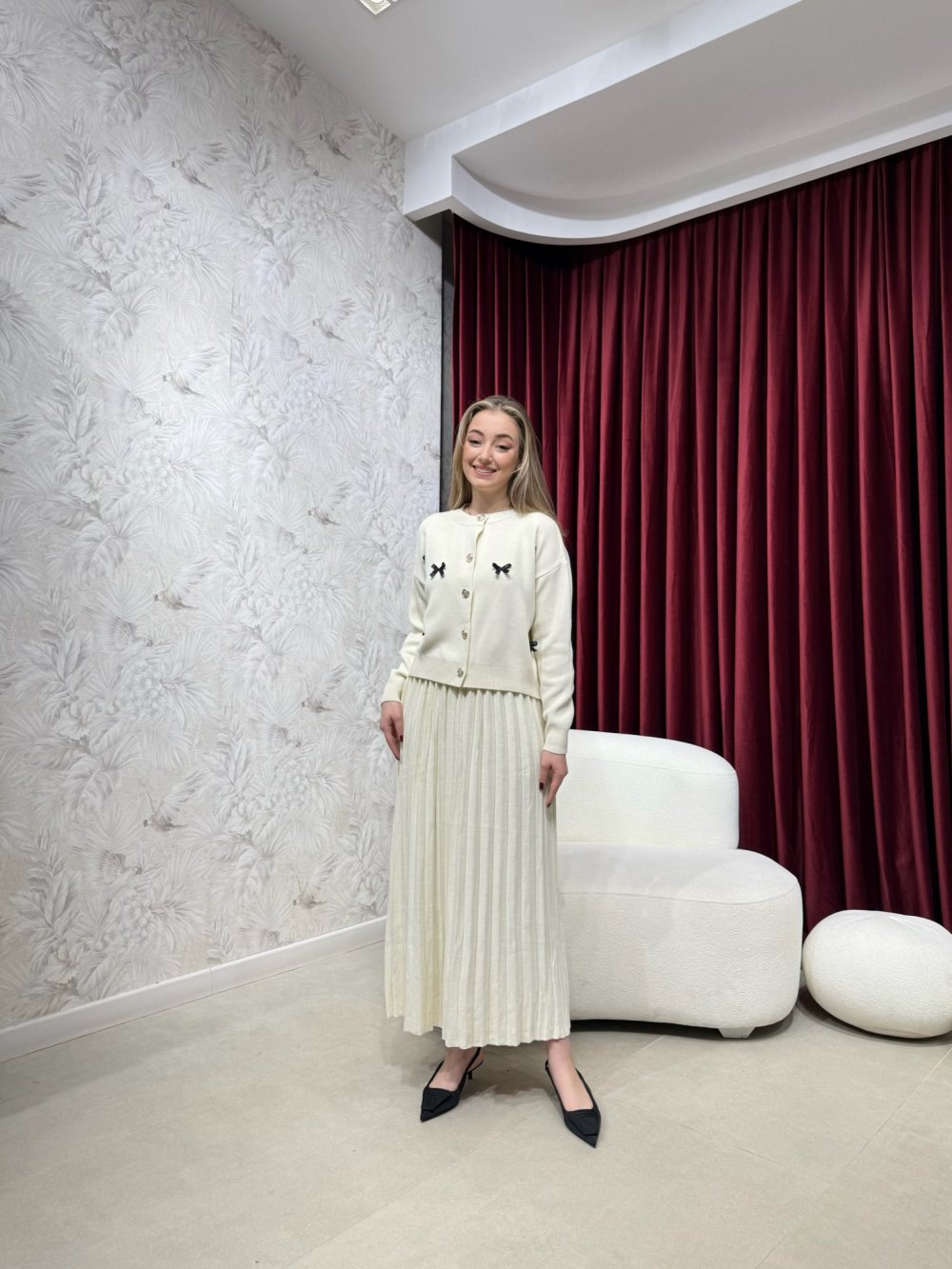 Hırka boydan aksesuar düğmeli, kurdele detaylı olup düşük omuzludur.