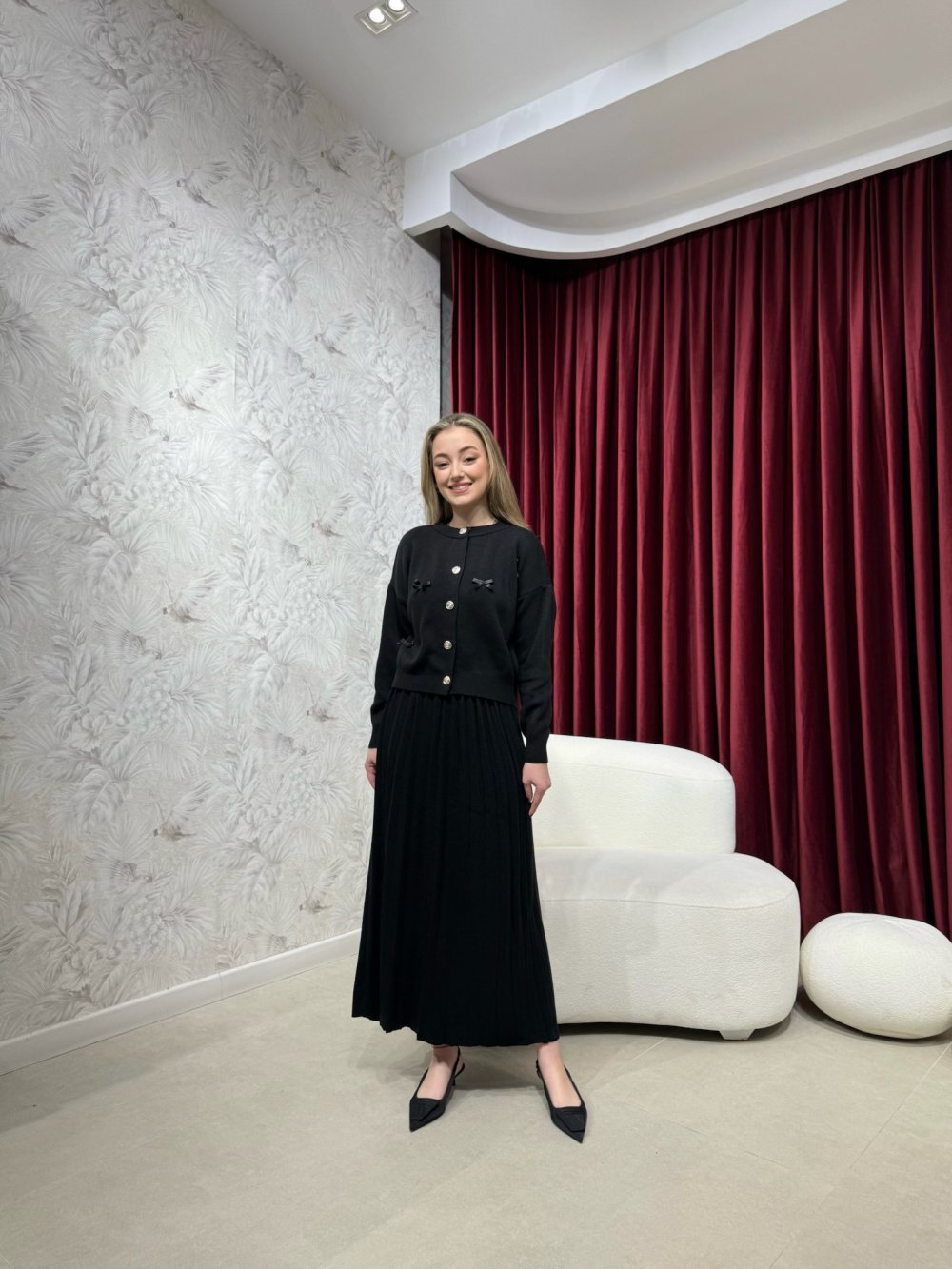 Hırka boydan aksesuar düğmeli, kurdele detaylı olup düşük omuzludur.