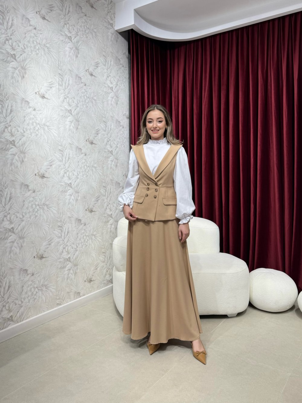 Ürünümüz krep kumaştan üretilmiştir. Kruvaze yaka, aksesuar düğme ve cep kapakları mevcuttur. Belden oturtmalı, arkadan fermuarlıdır. Üst kısmı artarlıdır.