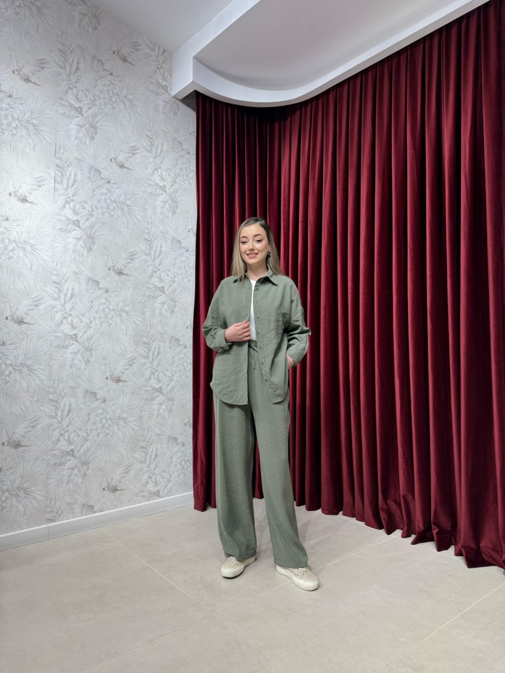 Ürünümüz modal kumaştan üretilmiştir. Gömlek klasik yaka, boydan düğmeli, kollar manşetli olup oversize kesime sahiptir.
