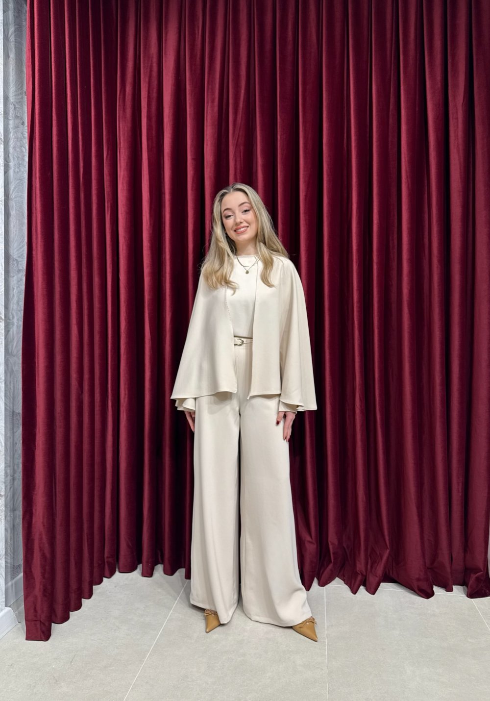 Pantolon beli düz, önden tek düğmeli, fermuarlı, önden çima dikişli olup bol paça formundadır.