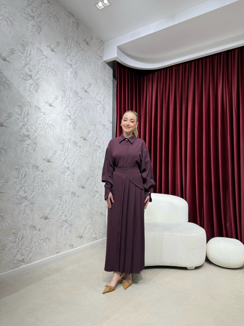 Ürünümüz krep kumaştan üretilmiştir. Klasik yaka, boydan gizli düğmeli, pile detaylı, kollar katlamalı olup manşetlidir. Aksesuar seyyar kemer ile birlikte gönderilmektedir.