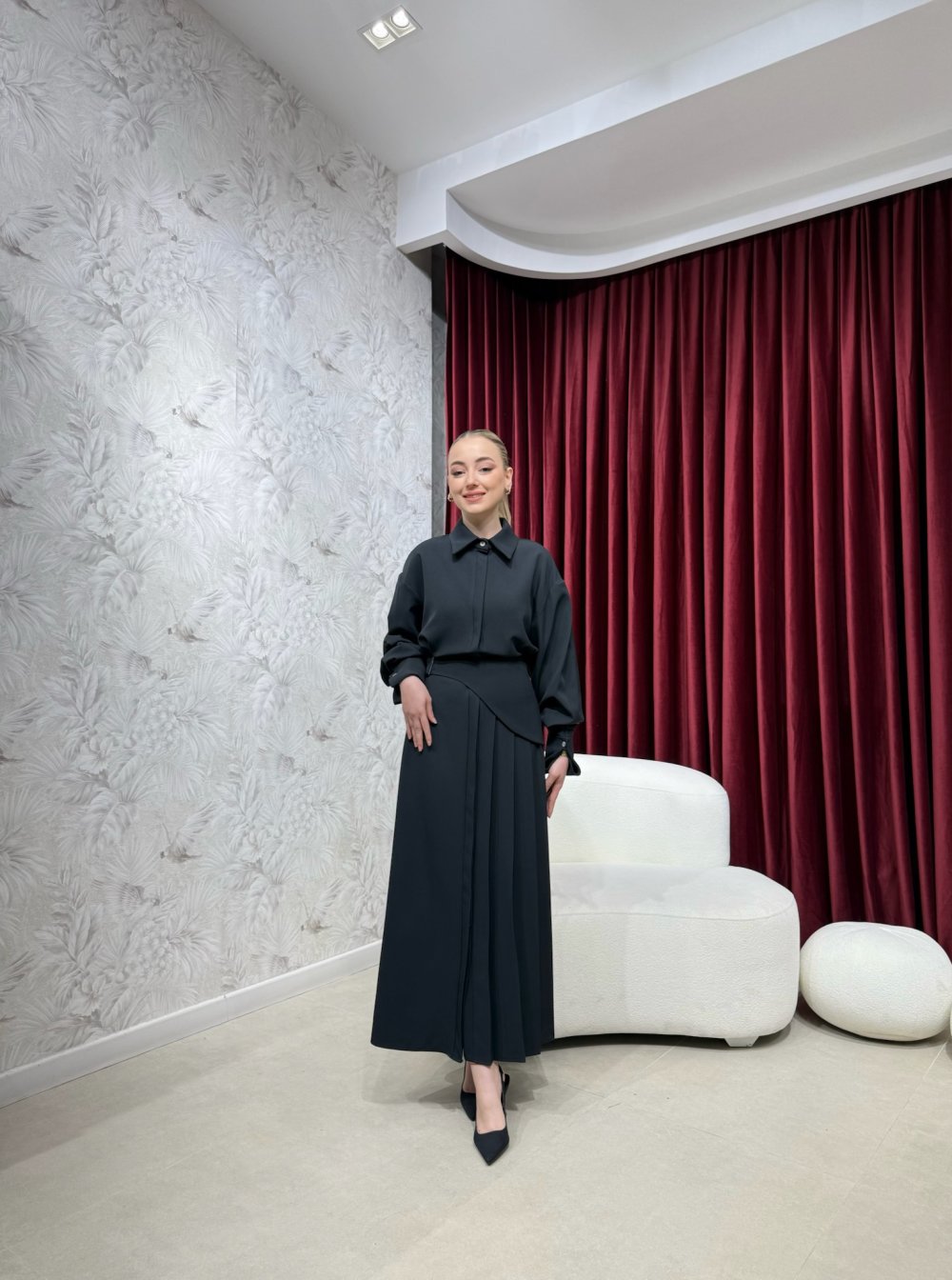 Ürünümüz krep kumaştan üretilmiştir. Klasik yaka, boydan gizli düğmeli, pile detaylı, kollar katlamalı olup manşetlidir. Aksesuar seyyar kemer ile birlikte gönderilmektedir.