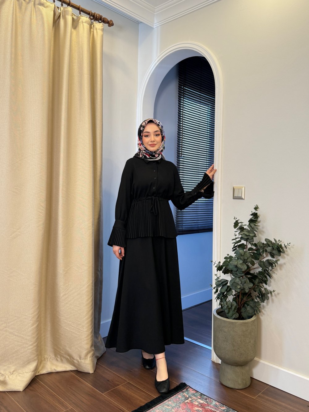 Üst ; bele kadar düğmeli, kol manşetli ve plise detaylı, belden ayarlanabilir lastiklidir, etek ucu pilise detaylıdır.