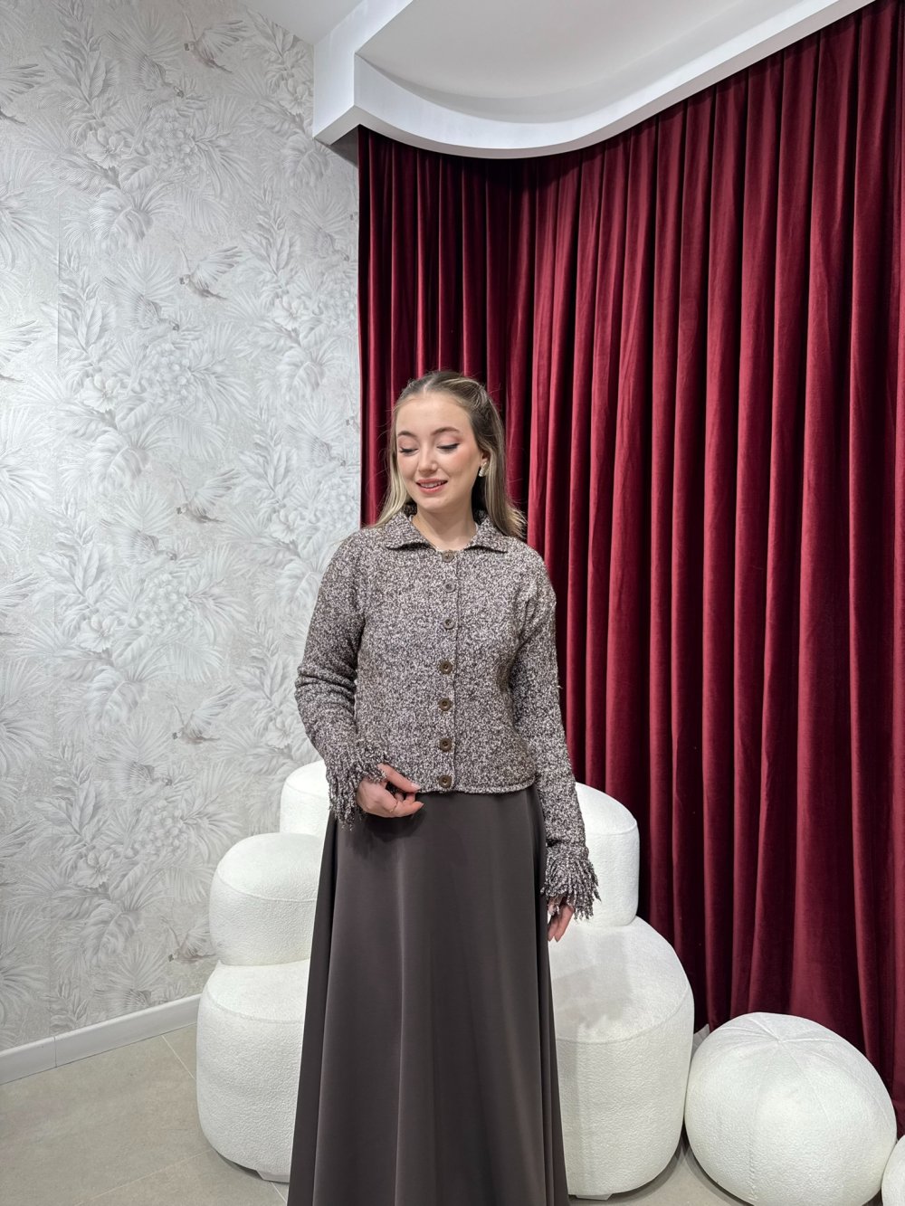 Klasik yaka, boydan düğmeli, kollarda püskül detayı mevcuttur.