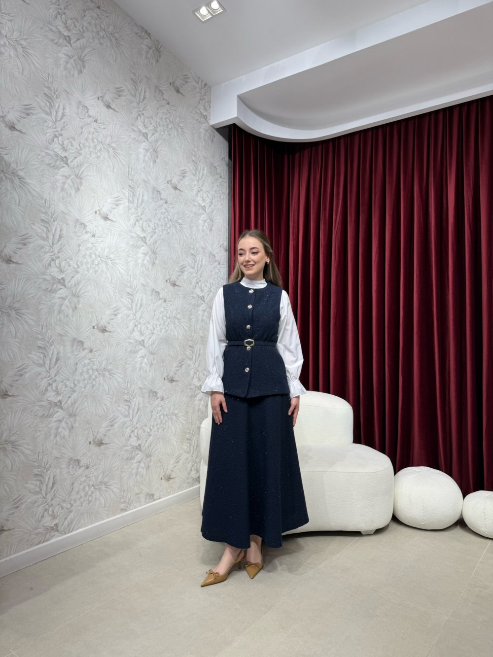 Yelek bisiklet yaka, boydan gold düğmeli, aktif iki ceplidir.