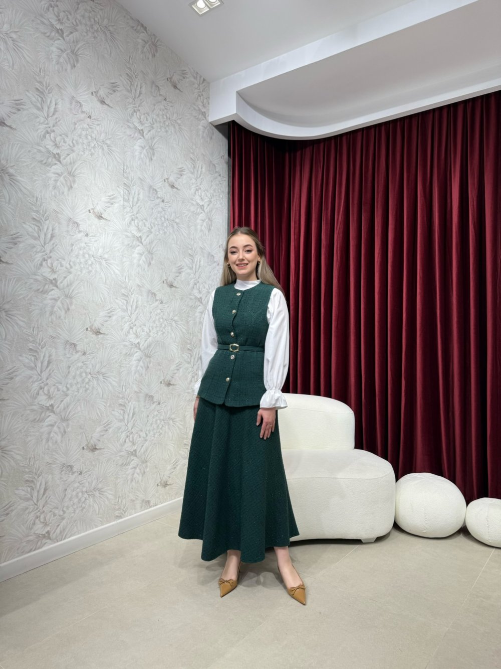 Yelek bisiklet yaka, boydan gold düğmeli, aktif iki ceplidir.