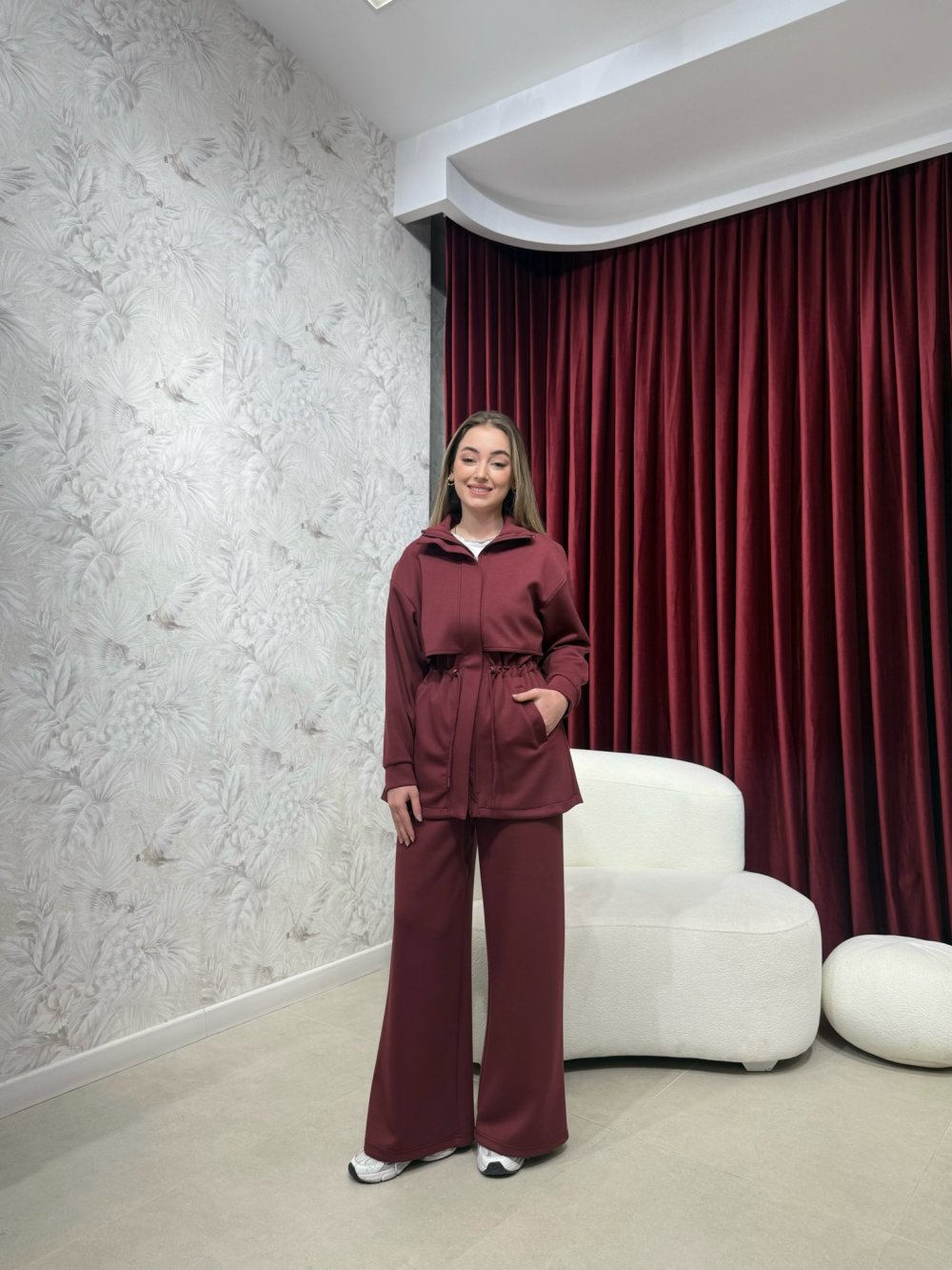 Ürünümüz Oysh kumaştan üretilmiştir. Dik yaka, boydan fermuarlı, belden ayarlanabilir tünel bağcıklıdır. Aktif iki cepli, düşük omuzludur.