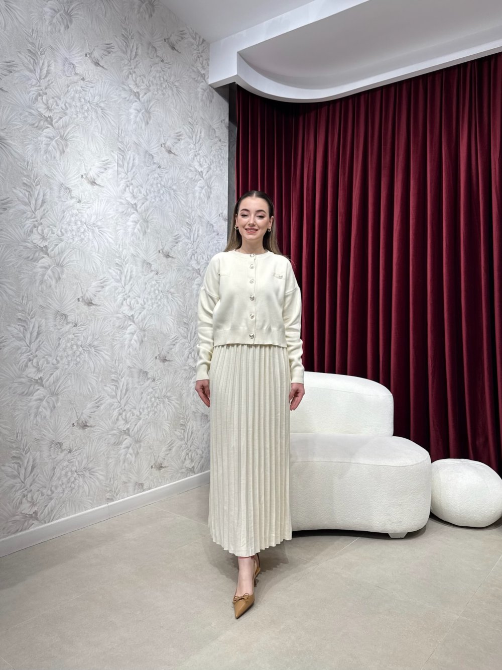 Hırka boydan aksesuar düğmeli, süs cep detaylı olup düşük omuzludur.
