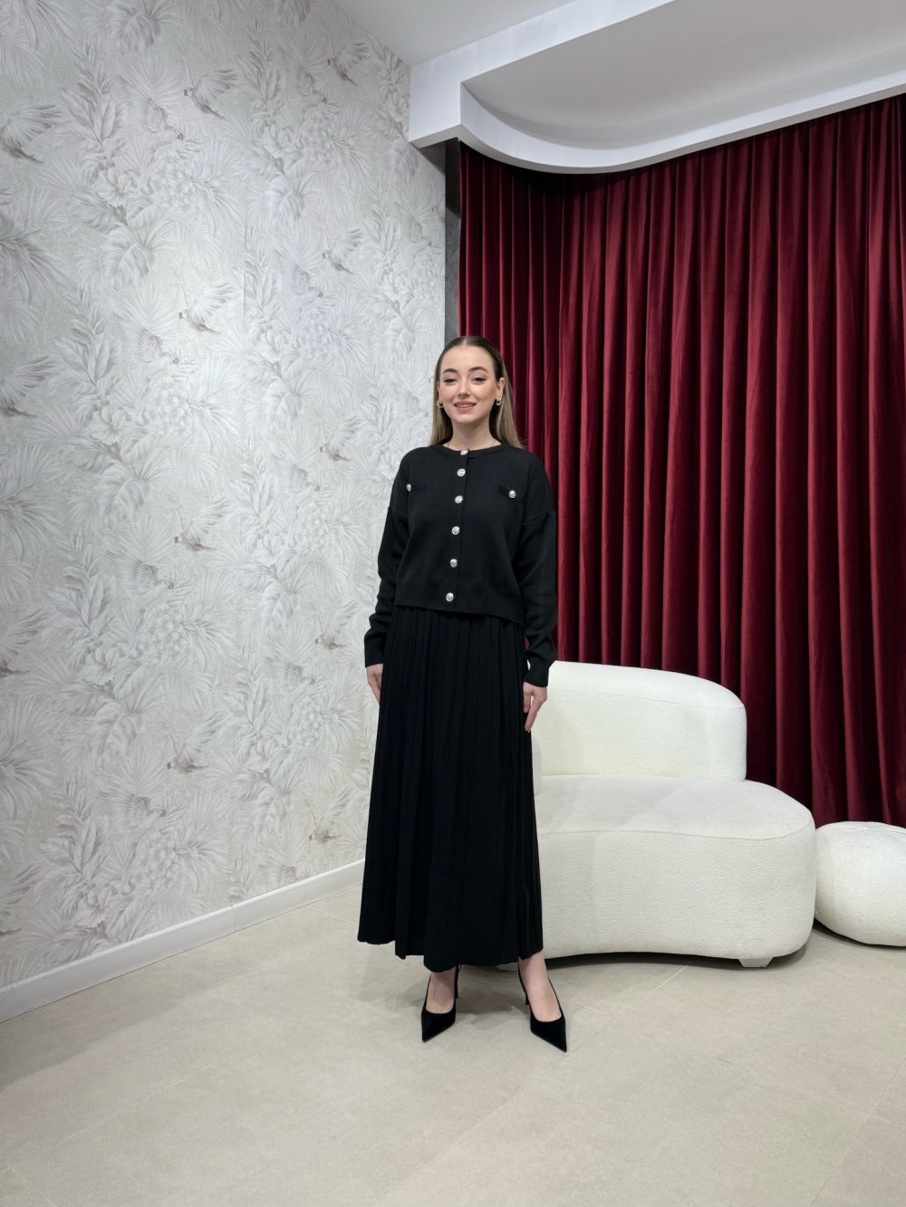 Hırka boydan aksesuar düğmeli, süs cep detaylı olup düşük omuzludur.