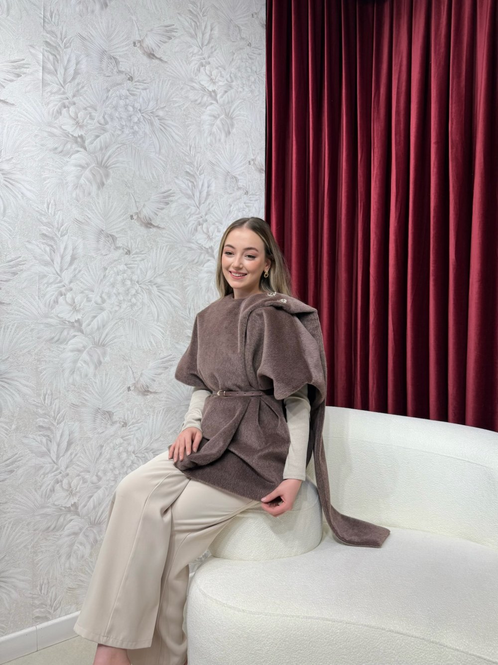 Yaka içten gizli düğmeli, düşük omuz, pelerin detaylı olup iki aksesuar düğmelidir. Astarlıdır.