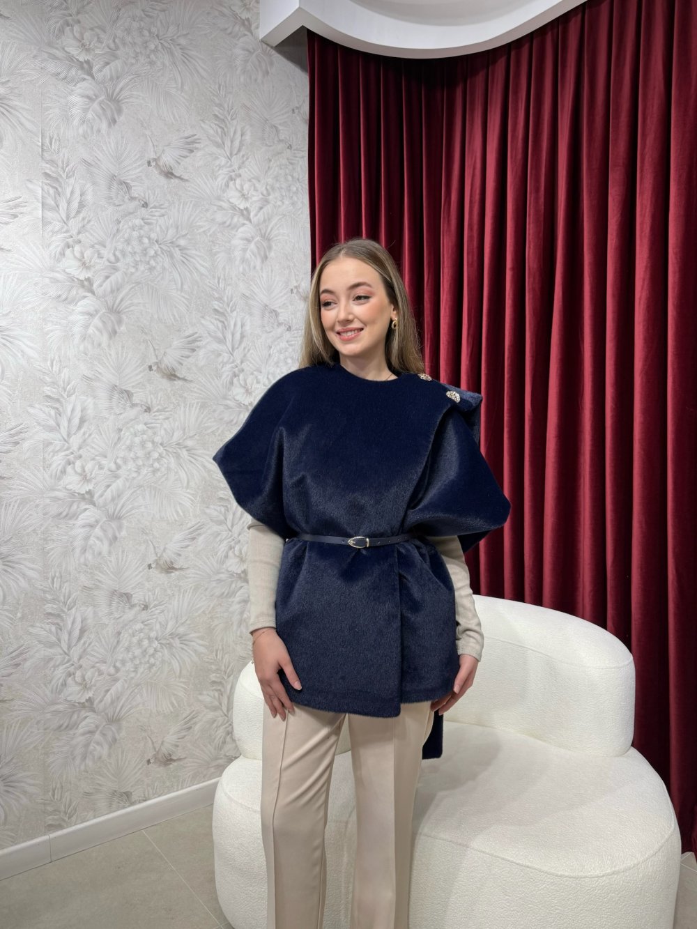 Yaka içten gizli düğmeli, düşük omuz, pelerin detaylı olup iki aksesuar düğmelidir. Astarlıdır.